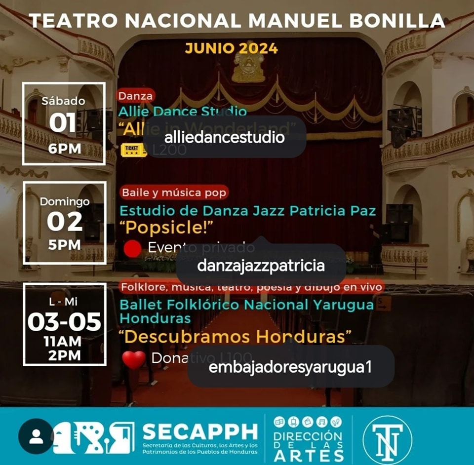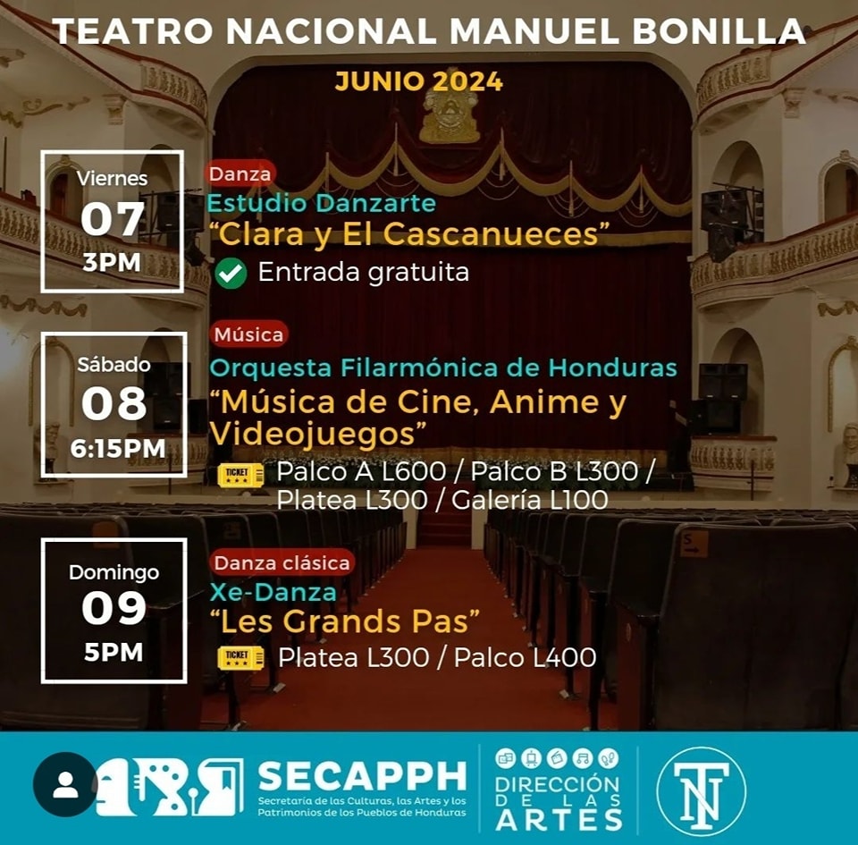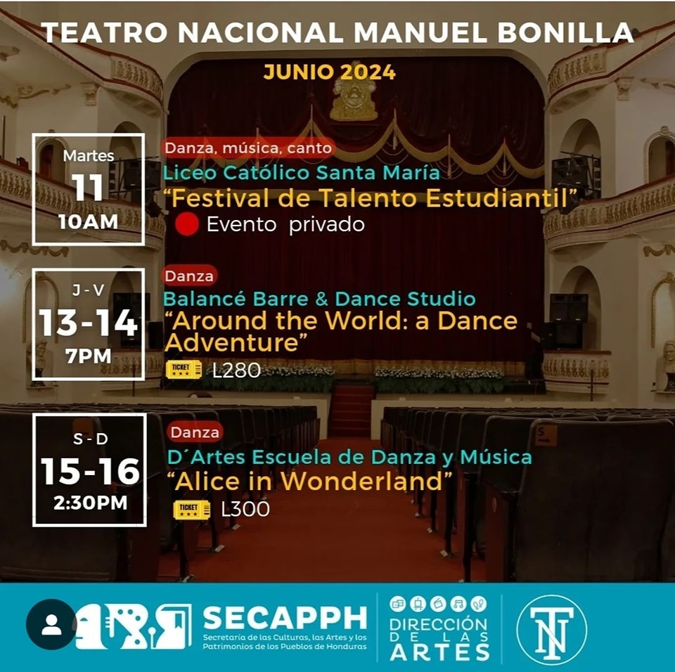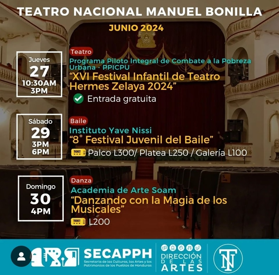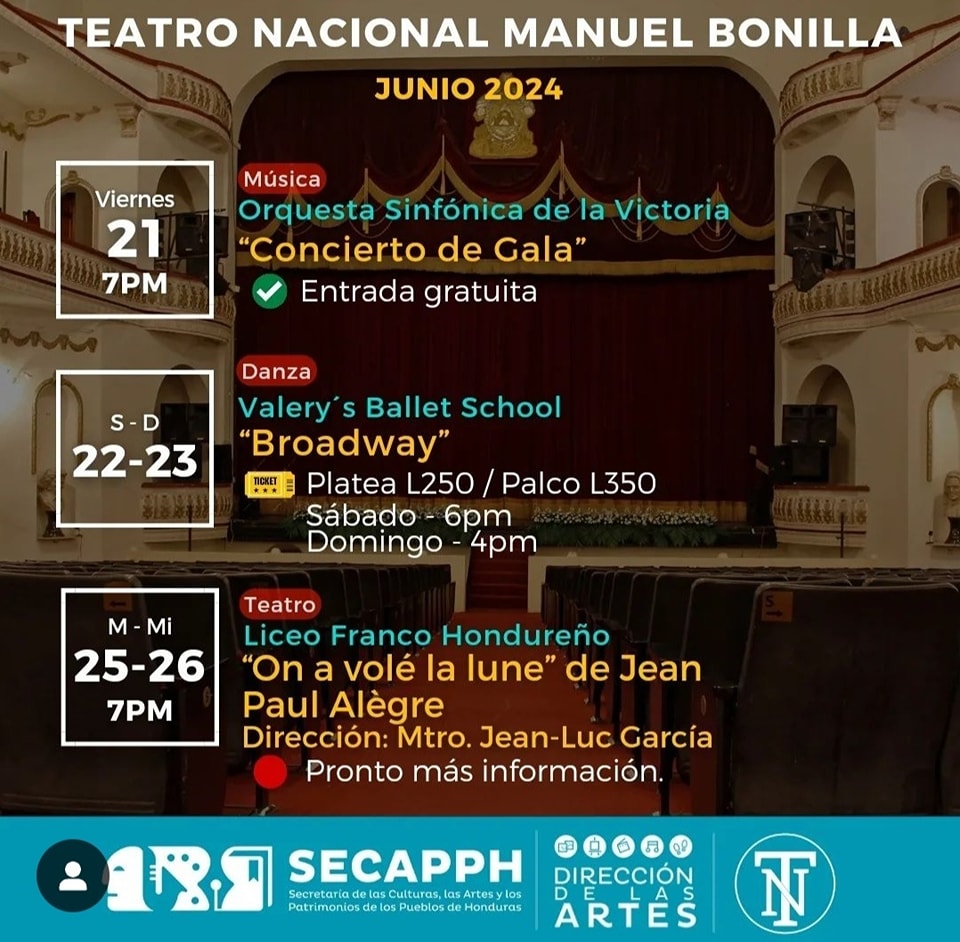 Agenda cultural del Teatro Nacional Manuel Bonilla – Junio Fecha de Inicio Sábado, Junio 1, 2024 - 06:00 PM Domingo, Junio 2, 2024 - 05:00 PM Lunes, Junio 3, 2024 - 11:00 AM Martes, Junio 4, 2024 - 11:00 AM Miércoles, Junio 5, 2024 - 11:00 AM Viernes, Junio 7, 2024 - 03:00 PM Sábado, Junio 8, 2024 - 06:15 PM Domingo, Junio 9, 2024 - 05:00 PM Viernes, Junio 7, 2024 - 03:00 PM Martes, Junio 11, 2024 - 10:00 AM Jueves, Junio 13, 2024 - 07:00 PM Viernes, Junio 14, 2024 - 07:00 PM Sábado, Junio 15, 2024 - 02:30 PM Domingo, Junio 16, 2024 - 02:30 PM Viernes, Junio 21, 2024 - 07:00 PM Sábado, Junio 22, 2024 - 06:00 PM Domingo, Junio 23, 2024 - 06:00 PM Martes, Junio 25, 2024 - 07:00 PM Miércoles, Junio 26, 2024 - 07:00 PM Jueves, Junio 27, 2024 - 10:30 AM Sábado, Junio 29, 2024 - 03:00 PM Domingo, Junio 30, 2024 - 04:00 PM Arte Les compartimos la agenda cultural del Teatro Nacional Manuel Bonilla para este mes de junio.Anda haciendo espacio en tu agenda para que puedas disfrutar de todas las actividades programadas especialmente para ti.
