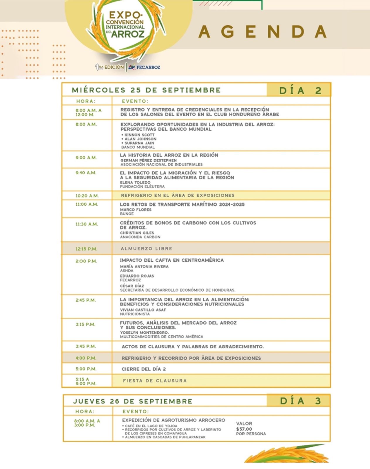 Agenda de la Expo Convención Internacional del Arroz Fecha de Inicio Miércoles, Septiembre 25, 2024 - 12:00 AM Jueves, Septiembre 26, 2024 - 12:00 AM Conferencia de prensa Agenda de la Expo Convención Internacional del Arroz