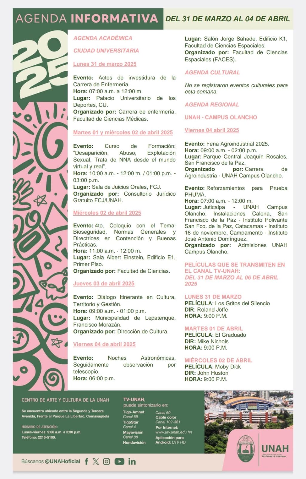 Agenda Informativa UNAH Fecha de Inicio Lunes, Marzo 31, 2025 - 12:00 AM Martes, Abril 1, 2025 - 12:00 AM Miércoles, Abril 2, 2025 - 12:00 AM Jueves, Abril 3, 2025 - 12:00 AM Viernes, Abril 4, 2025 - 12:00 AM Conferencia de prensa Agenda Informativa UNAH