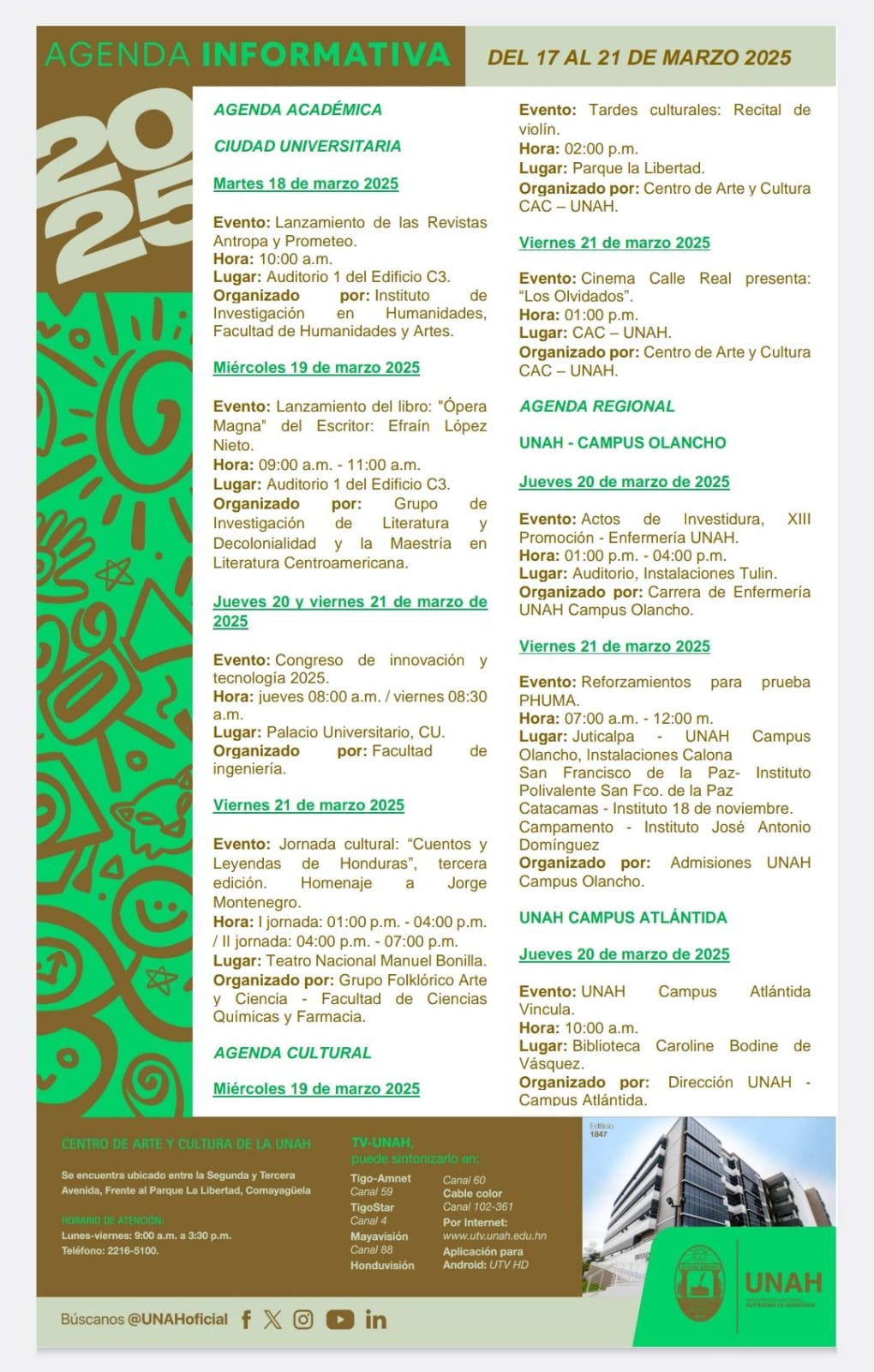 Agenda UNAH Fecha de Inicio Lunes, Marzo 17, 2025 - 12:00 AM Martes, Marzo 18, 2025 - 12:00 AM Miércoles, Marzo 19, 2025 - 12:00 AM Jueves, Marzo 20, 2025 - 12:00 AM Viernes, Marzo 21, 2025 - 12:00 AM Conferencia de prensa Agenda UNAH