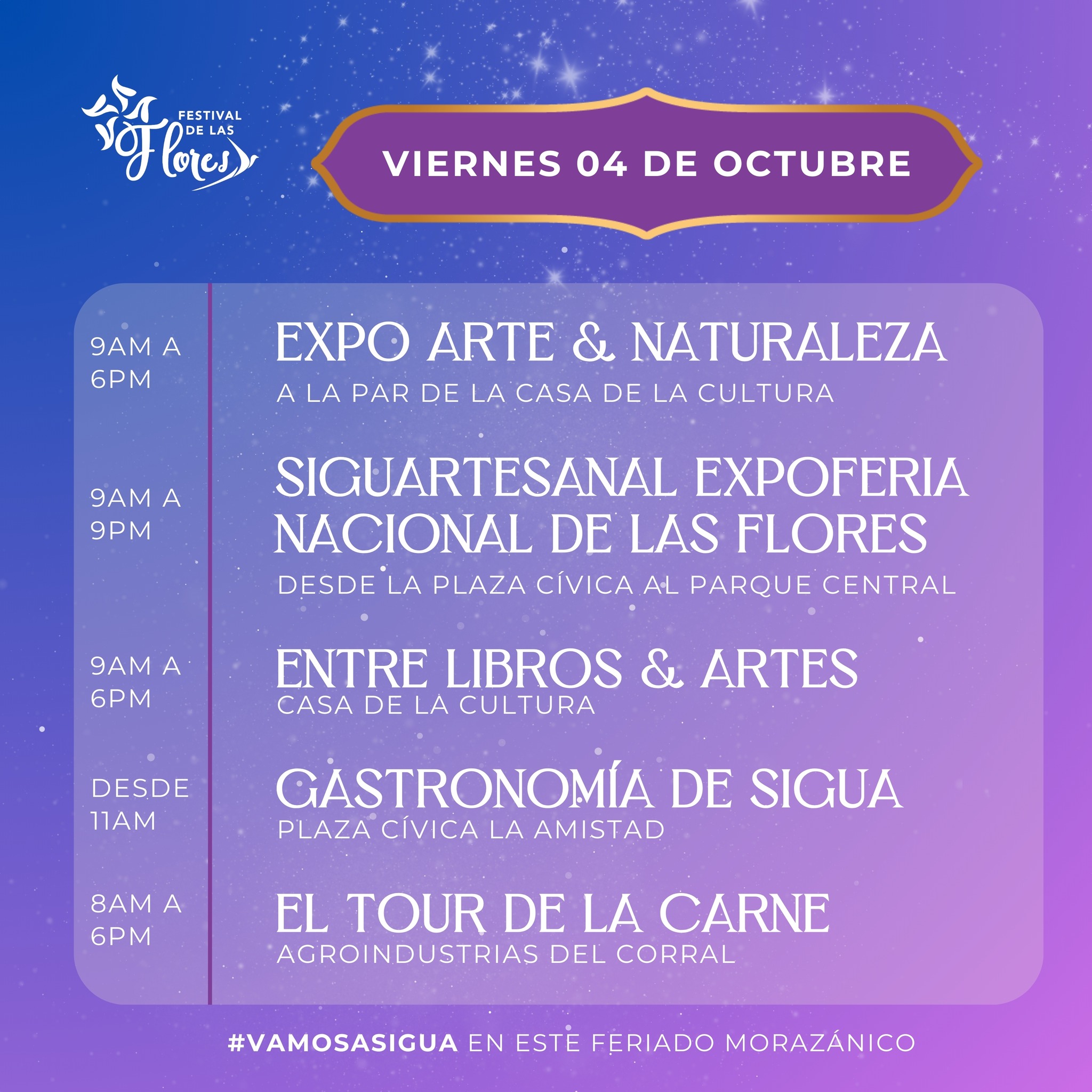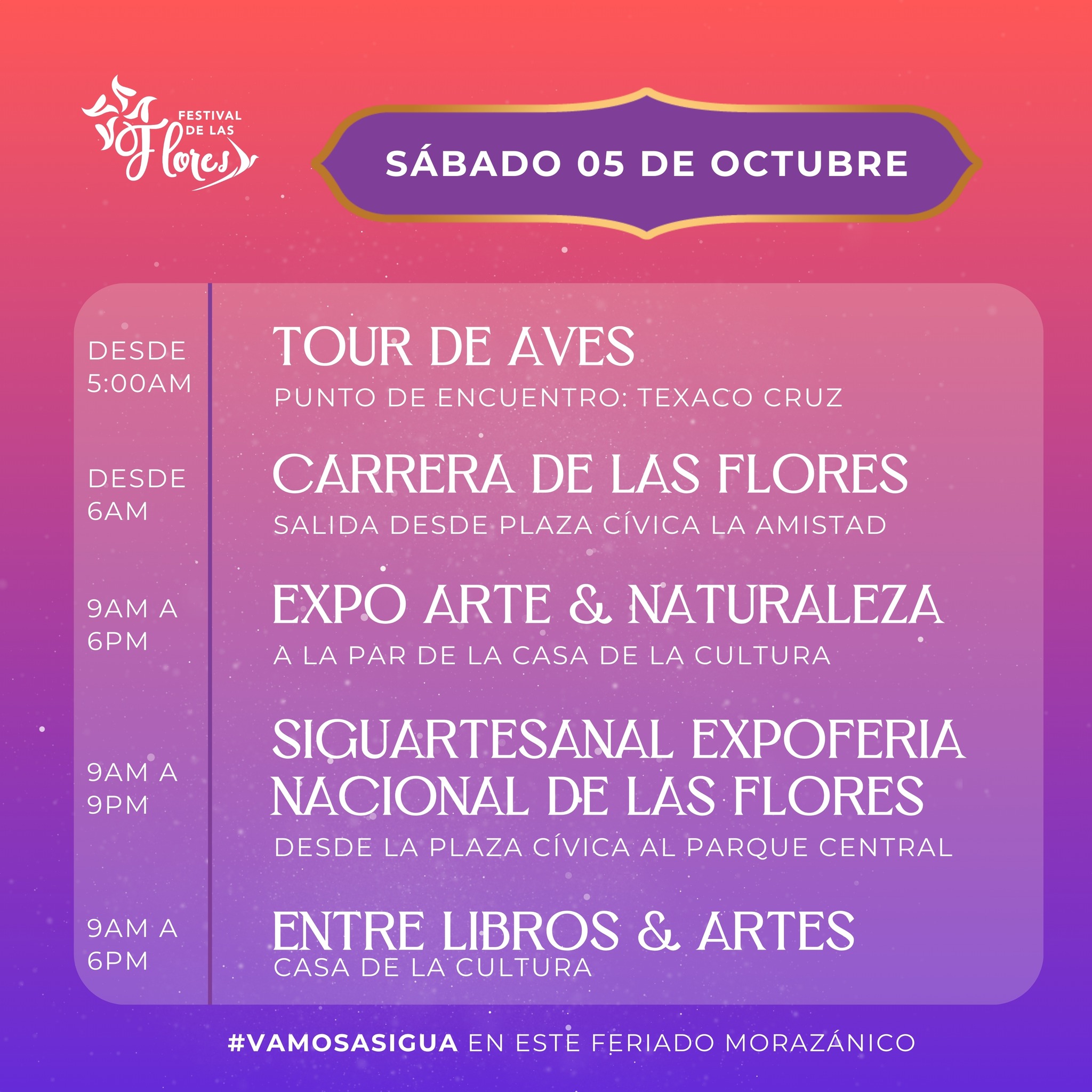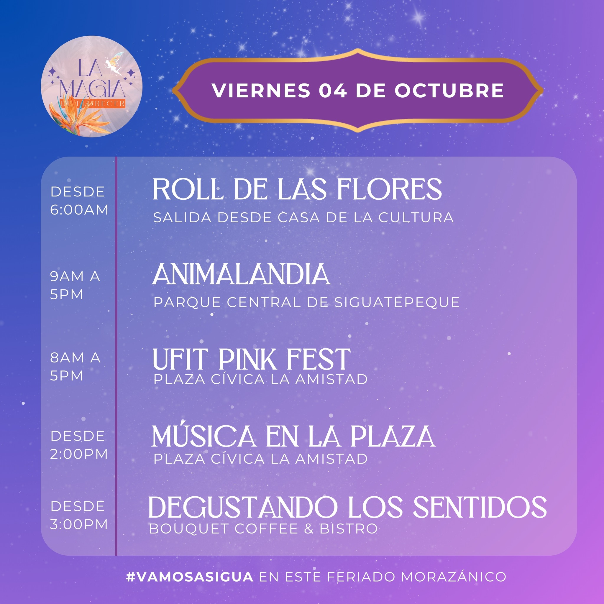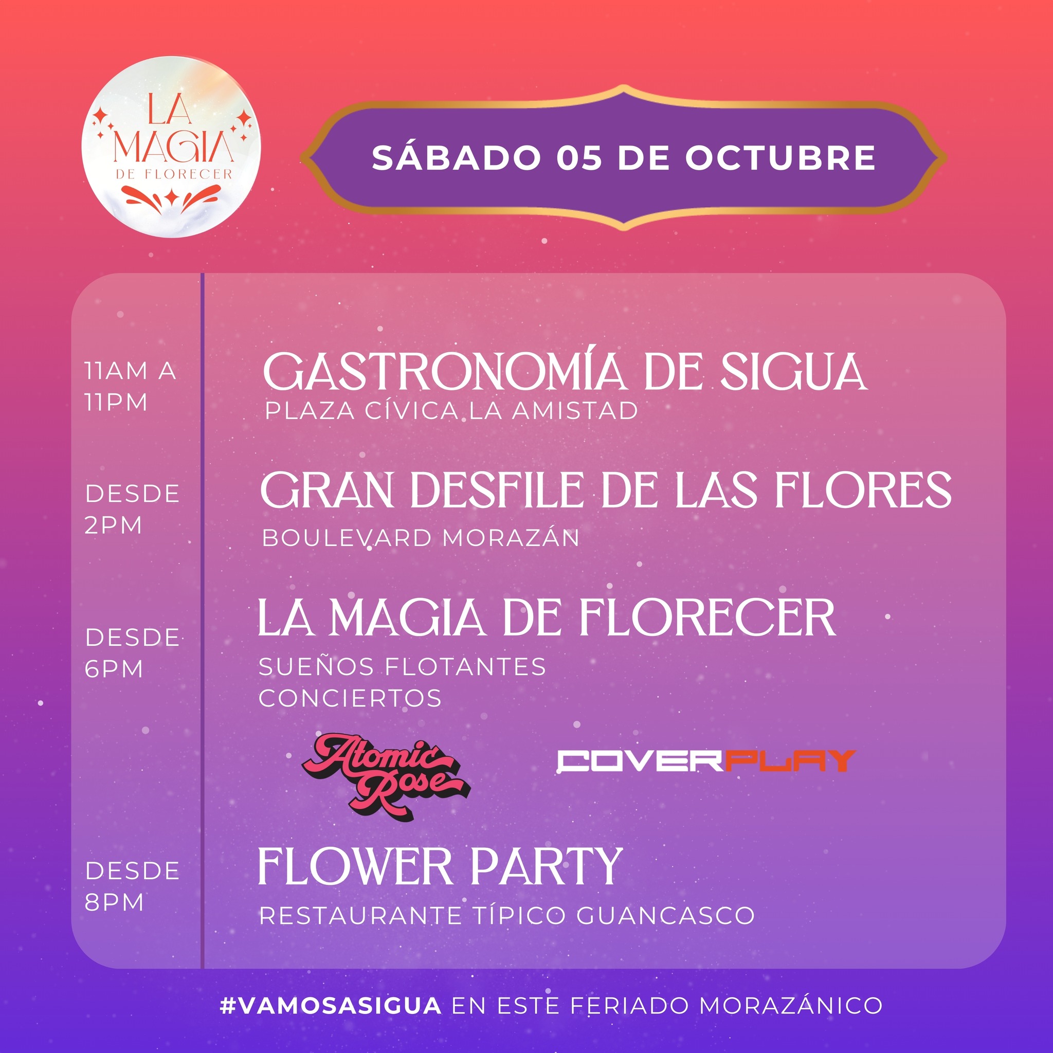 Del 3 al 6 de octubre, ven a Siguatepeque a vivir una experiencia inolvidable llena de arte, m煤sica, deporte, gastronom铆a y la magia de florecer. Cada d铆a del festival est谩 repleto de actividades para todos los gustos. 隆Descubre todo lo que hemos preparado para ti!