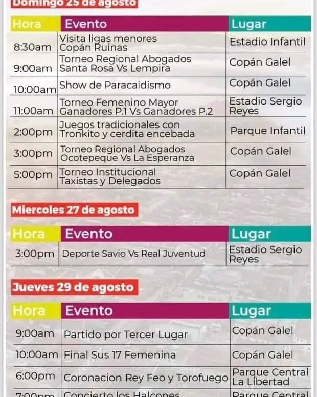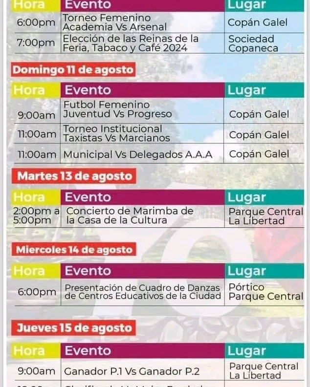 Programación de la feria de Santa Rosa de Copán Fecha de Inicio Viernes, Agosto 2, 2024 - 12:00 AM Sábado, Agosto 3, 2024 - 12:00 AM Domingo, Agosto 4, 2024 - 12:00 AM Sábado, Agosto 10, 2024 - 12:00 AM Domingo, Agosto 11, 2024 - 12:00 AM Martes, Agosto 13, 2024 - 12:00 AM Miércoles, Agosto 14, 2024 - 12:00 AM Jueves, Agosto 15, 2024 - 12:00 AM Viernes, Agosto 16, 2024 - 12:00 AM Sábado, Agosto 17, 2024 - 12:00 AM Domingo, Agosto 18, 2024 - 12:00 AM Jueves, Agosto 22, 2024 - 12:00 AM Sábado, Agosto 24, 2024 - 12:00 AM Domingo, Agosto 25, 2024 - 12:00 AM Martes, Agosto 27, 2024 - 12:00 AM Jueves, Agosto 29, 2024 - 12:00 AM Viernes, Agosto 30, 2024 - 12:00 AM Sábado, Agosto 31, 2024 - 12:00 AM Cultura y Patrimonio Les compartimos la programación de la feria de Santa Rosa de Copán para que puedas disfrutar con tu familia.