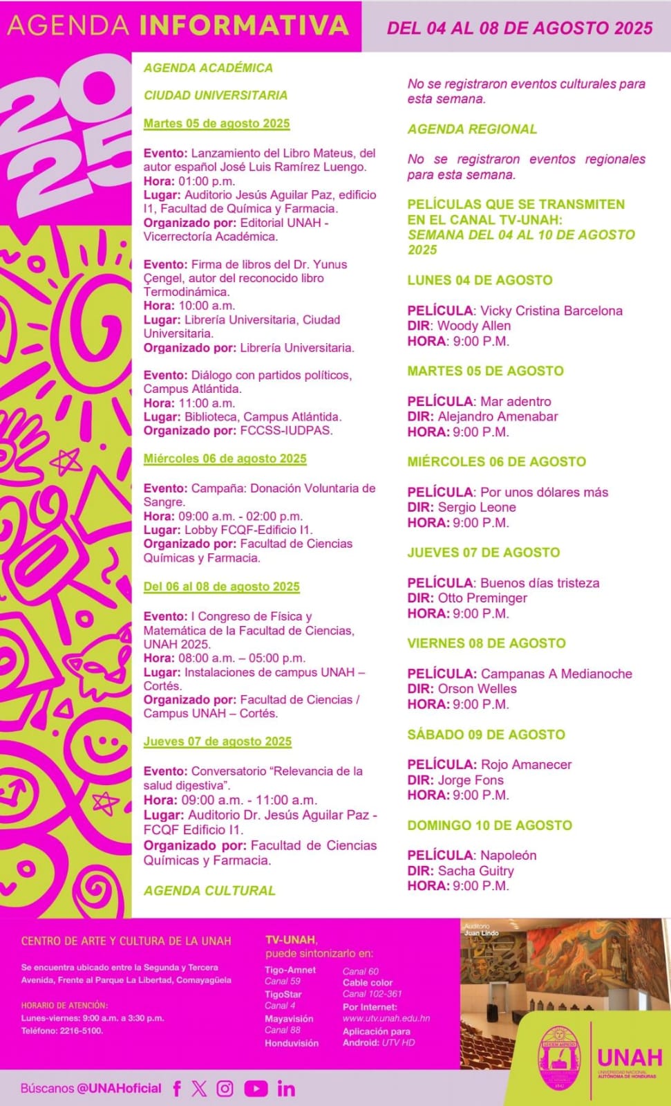 UNAH: Agenda Informática semanal Fecha de Inicio Lunes, Agosto 4, 2025 - 12:00 AM Martes, Agosto 5, 2025 - 12:00 AM Miércoles, Agosto 6, 2025 - 12:00 AM Jueves, Agosto 7, 2025 - 12:00 AM Viernes, Agosto 8, 2025 - 12:00 AM Conferencia de prensa UNAH: Agenda Informática semanal