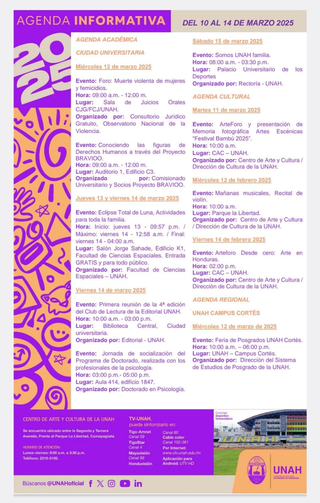 UNAH: Agenda Informativa 10 -14 marzo 2025 Fecha de Inicio Lunes, Marzo 10, 2025 - 12:00 AM Martes, Marzo 11, 2025 - 12:00 AM Miércoles, Marzo 12, 2025 - 12:00 AM Jueves, Marzo 13, 2025 - 12:00 AM Viernes, Marzo 14, 2025 - 12:00 AM Conferencia de prensa UNAH: Agenda Informativa 10 -14 marzo 2025
