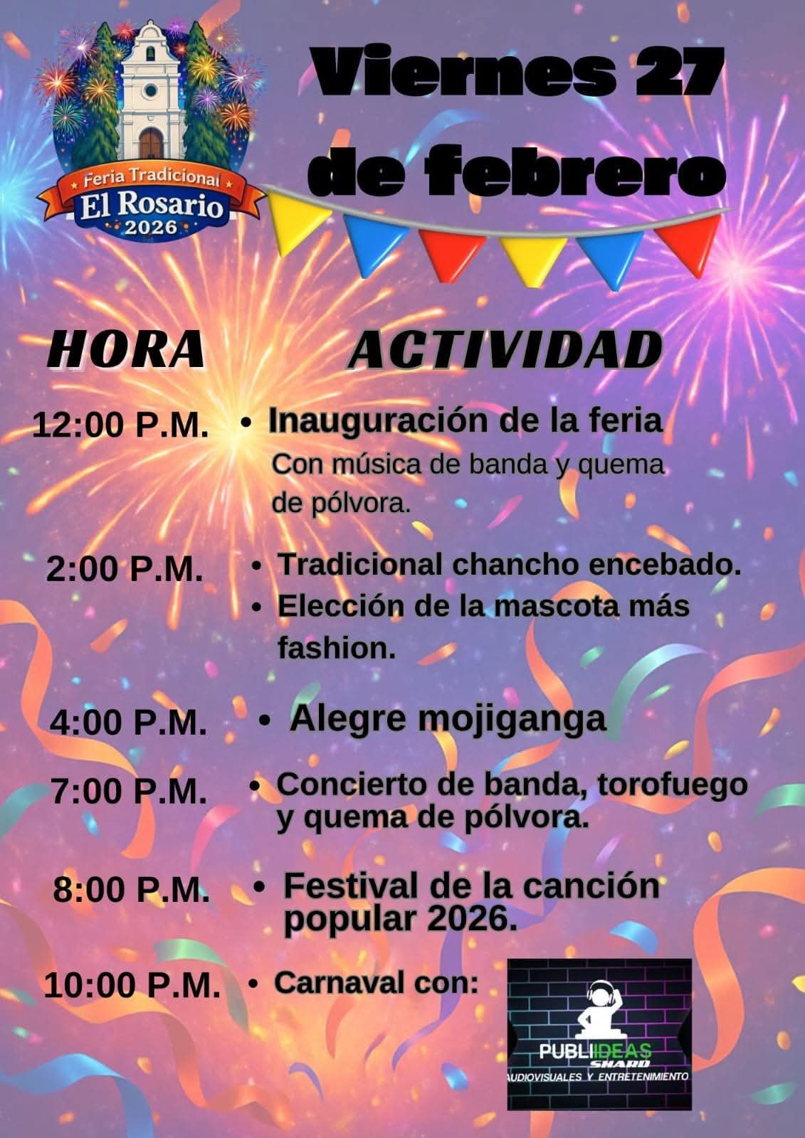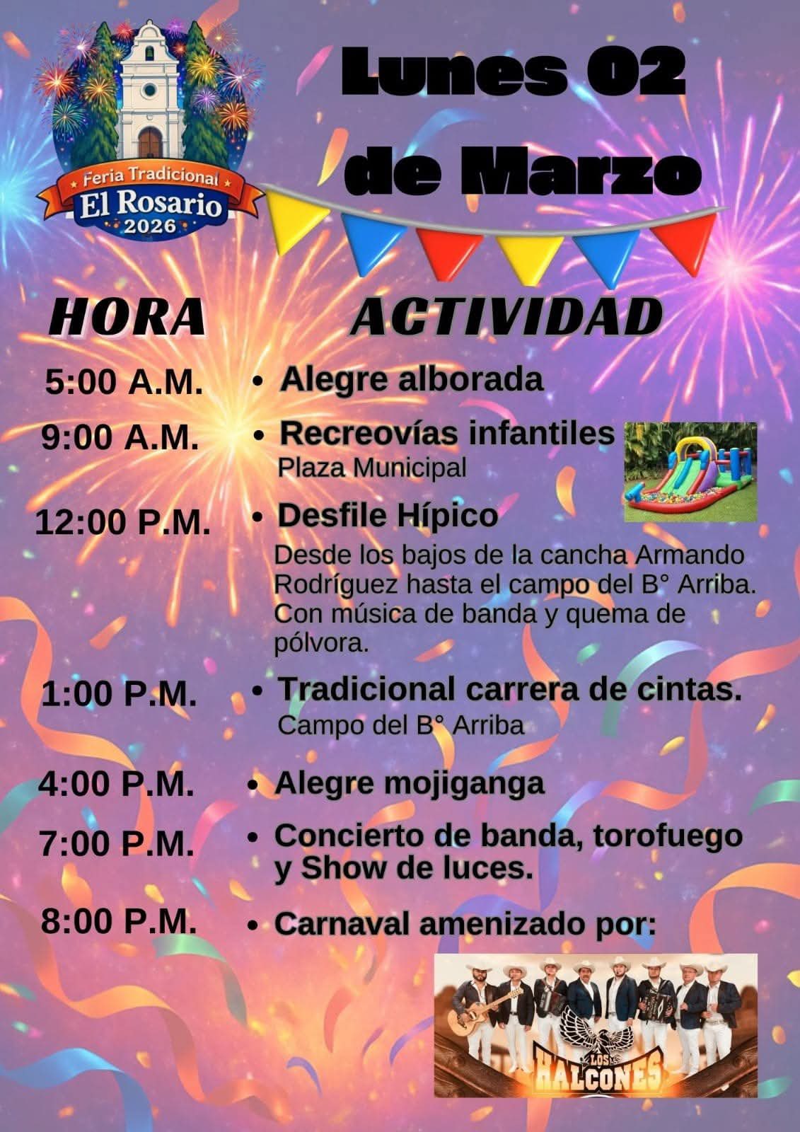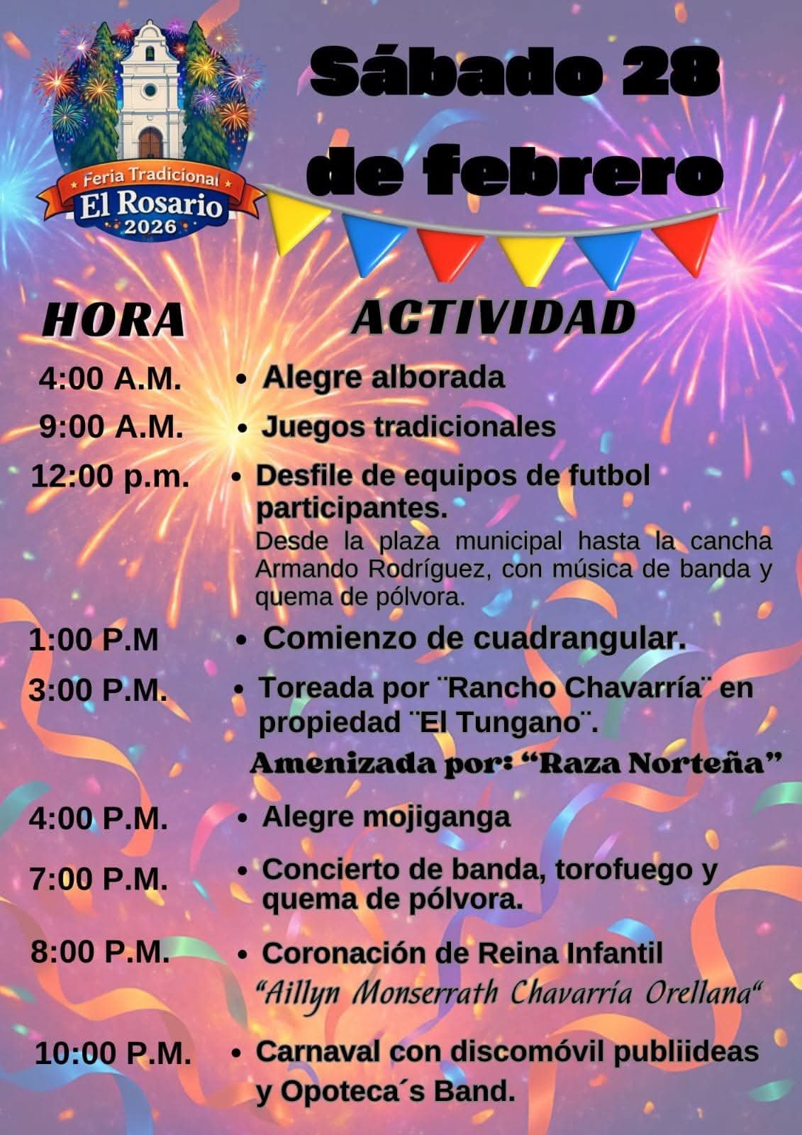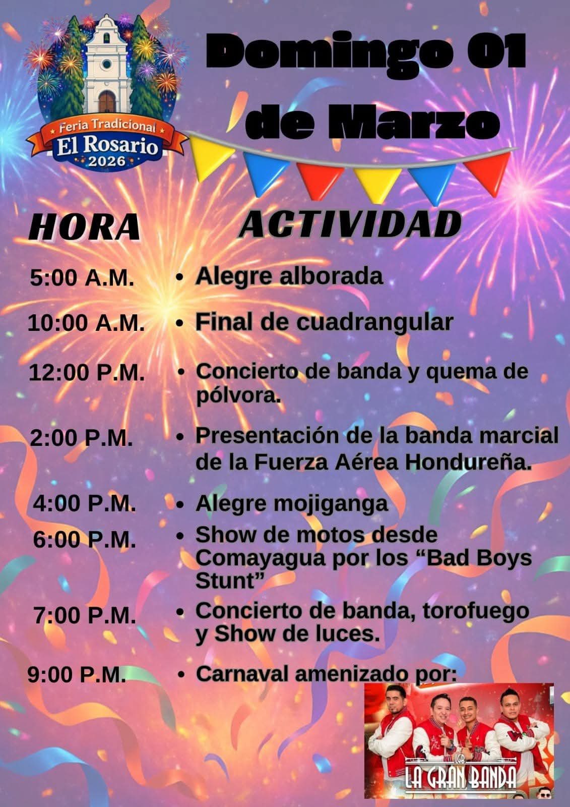 Feria Tradicional El Rosario – 2026 Fecha de Inicio Viernes, Febrero 27, 2026 - 12:00 AM Sábado, Febrero 28, 2026 - 12:00 AM Domingo, Marzo 1, 2026 - 12:00 AM Lunes, Marzo 2, 2026 - 12:00 AM Cultura y Patrimonio Feria Tradicional El Rosario – 2026 El Municipio de El Rosario, Comayagua esa de feria del 27 de febrero al 02 de Marzo, están todos cordialmente invitados. ´