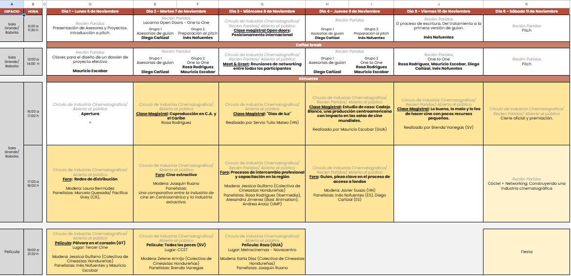 El programa de taller, charlas y conferencias abiertas al público se desarrollará en la sede del Centro Cultural de España en Tegucigalpa, e incluye clases magistrales  y mesas redondas. La programación se completa con un ciclo de proyecciones de cine.