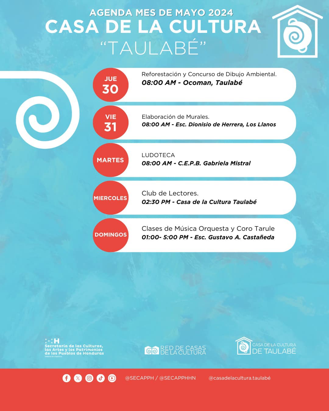 Les compartimos la agenda de actividades de nuestra Casa de la Cultura del Taulabé para el resto del mes de mayo.