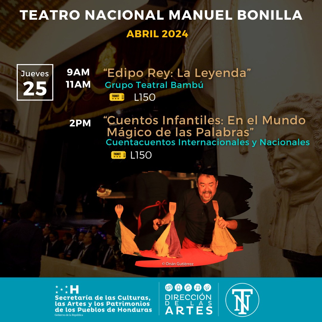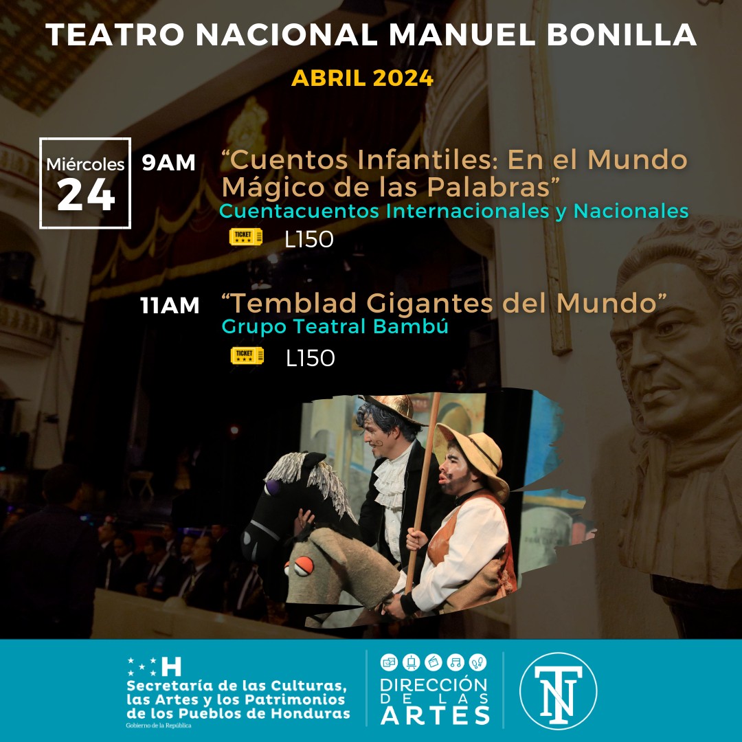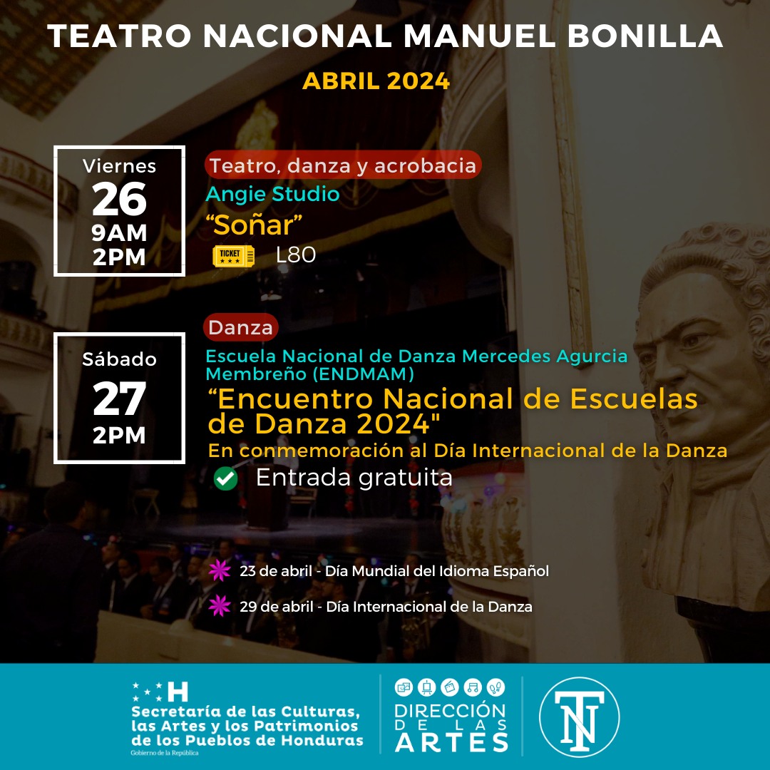Hola amigas y amigos del Teatro Nacional Manuel Bonilla, en esta oportunidad tenemos el enorme agrado de compartir con ustedes la Agenda Cultural del presente mes de Abril 2024. (2da Parte)