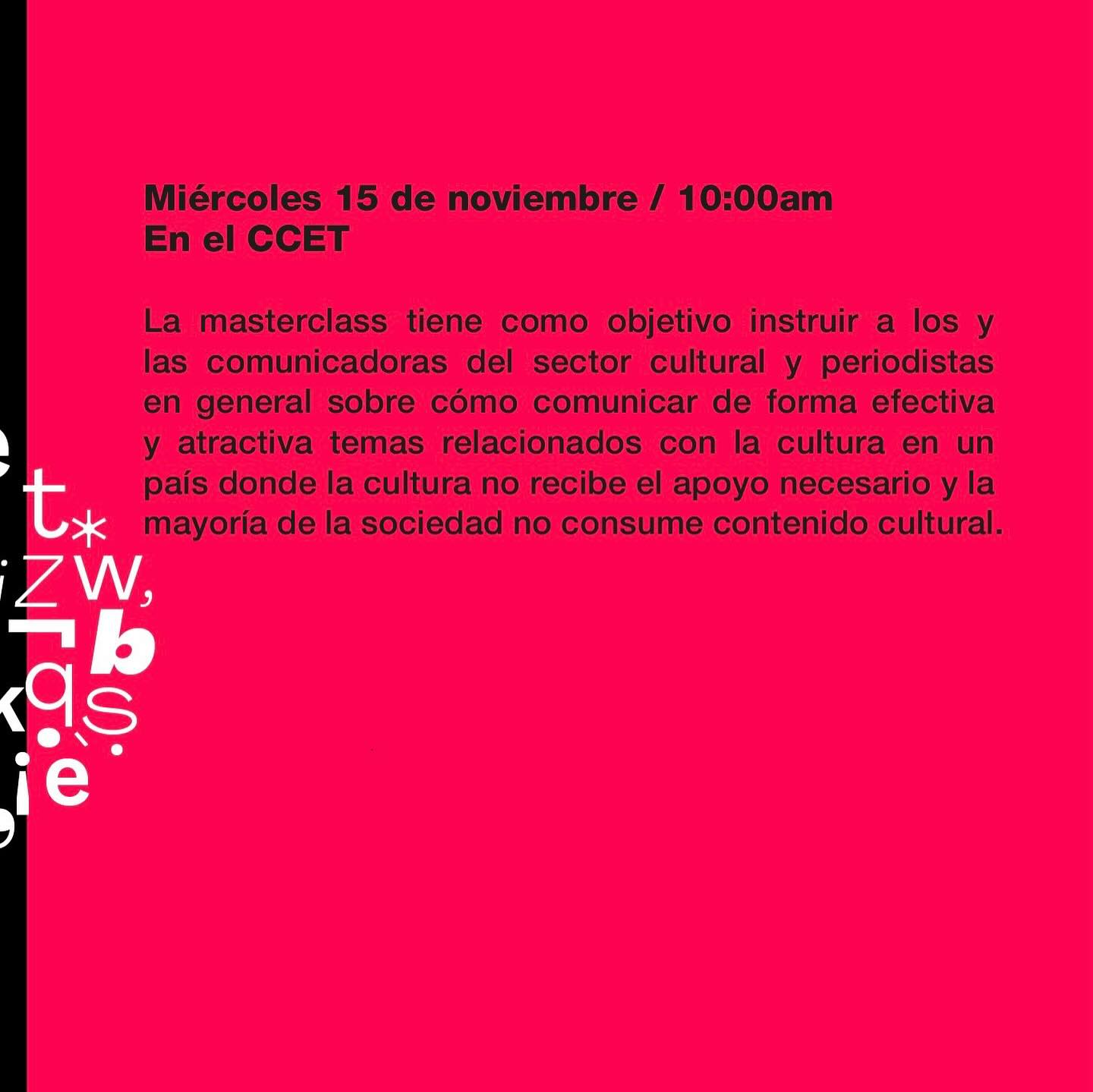 Por medio de la masterclass se instruirá a los comunicadores del sector cultural sobre cómo comunicar temas relacionados con la cultura en un país donde la cultura no recibe el apoyo necesario y la mayoría de la sociedad no consume contenido cultural lo cual influye muchas veces en la forma de comunicar los eventos relacionados con cultura y arte.