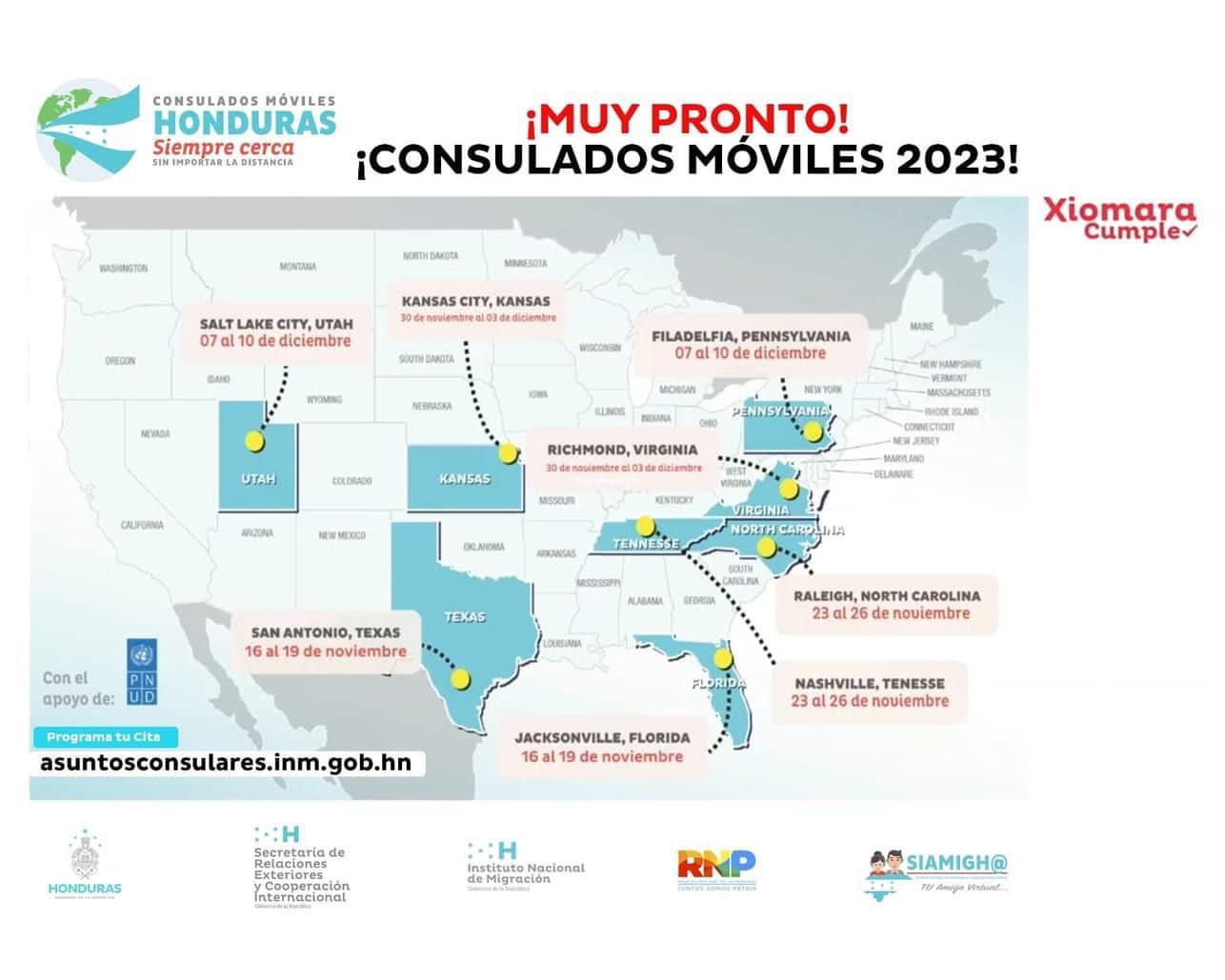 ¡Honduras siempre cerca! Estas son las ciudades de los Estados Unidos donde se instalarán los Consulados Móviles, para que los connacionales puedan realizar sus citas para pasaportes, enrolamientos y gestiones consulares.