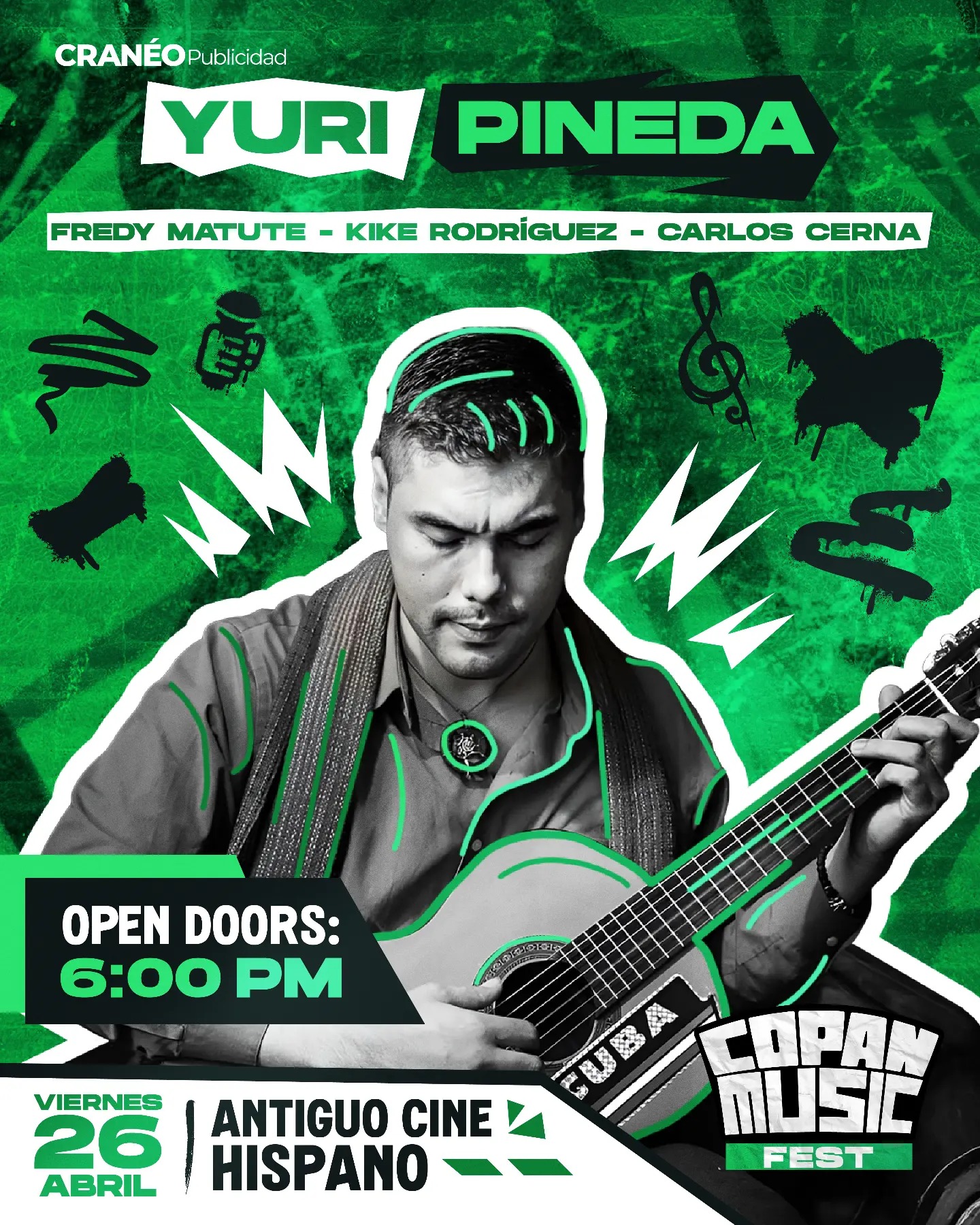 Copan Music Fest 2024 Fecha de Inicio Viernes, Abril 26, 2024 - 06:00 AM Arte Copan Music Fest 2024 Ubicación: Antiguo cine hispano Santa Rosa de Copan