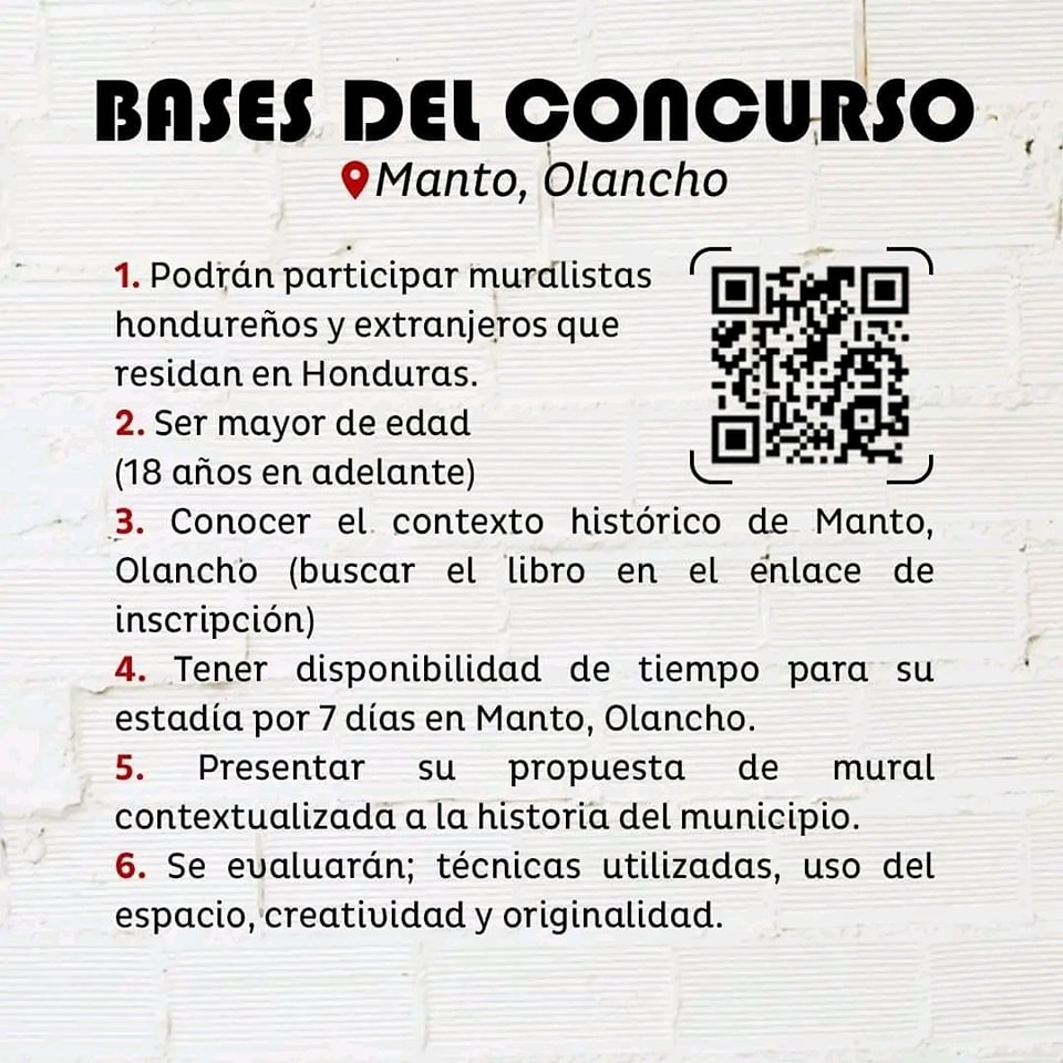Se les invita a participar en el Concurso de Muralismo "Pintando Honduras" a realizarse en Manto, Olancho, el cual busca resaltar la historia y cultura de los diferentes municipios del país a través del arte ![]()