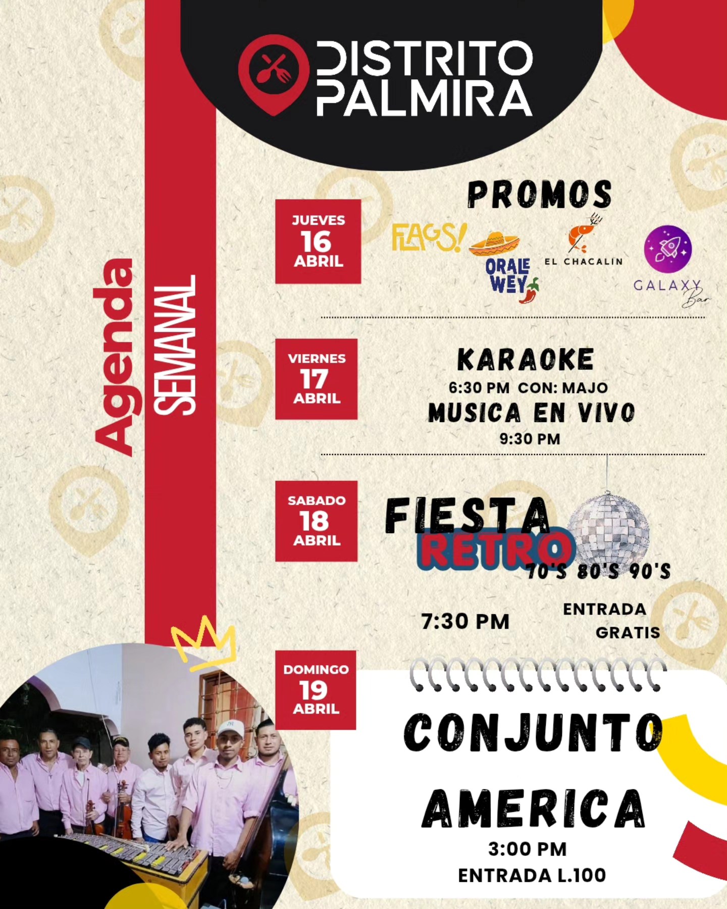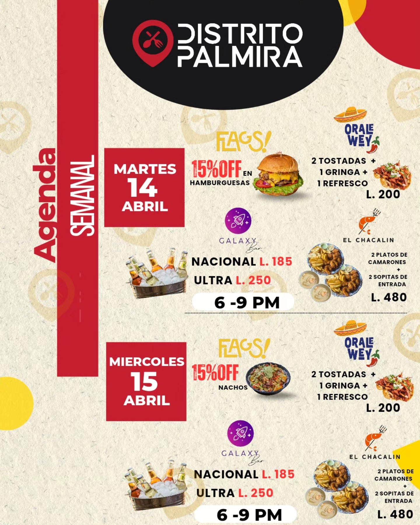 Agenda Semanal Distrito Palmira Fecha de Inicio Martes, Abril 14, 2026 - 12:00 AM Mi茅rcoles, Abril 15, 2026 - 12:00 AM Jueves, Abril 16, 2026 - 12:00 AM Viernes, Abril 17, 2026 - 12:00 AM S谩bado, Abril 18, 2026 - 12:00 AM Domingo, Abril 19, 2026 - 12:00 AM Entretenimiento y Medios 隆Tu lugar de encuentro en TGU !Esta semana la agenda viene cargada de Promociones y Eventos para que disfrutes a lo grande