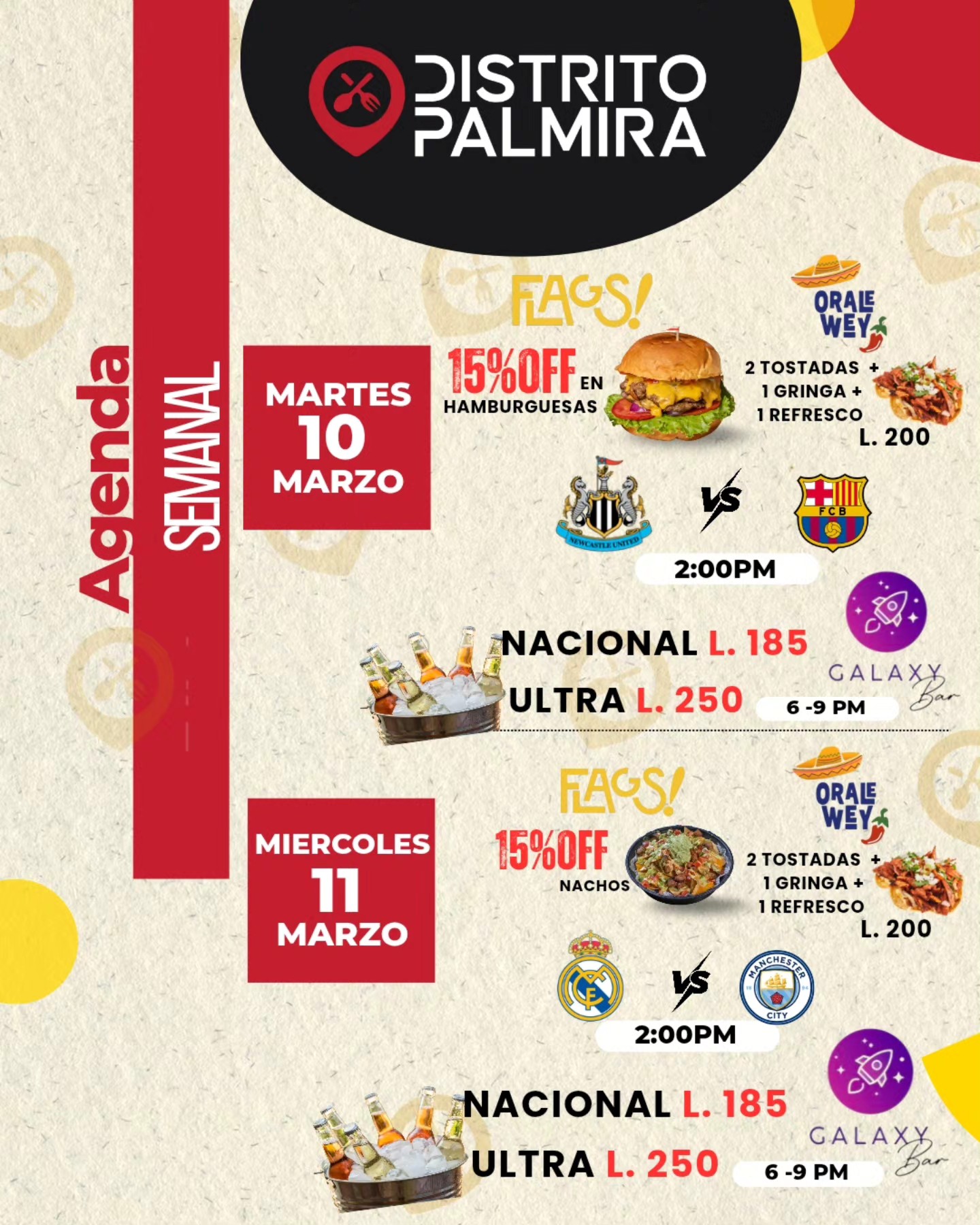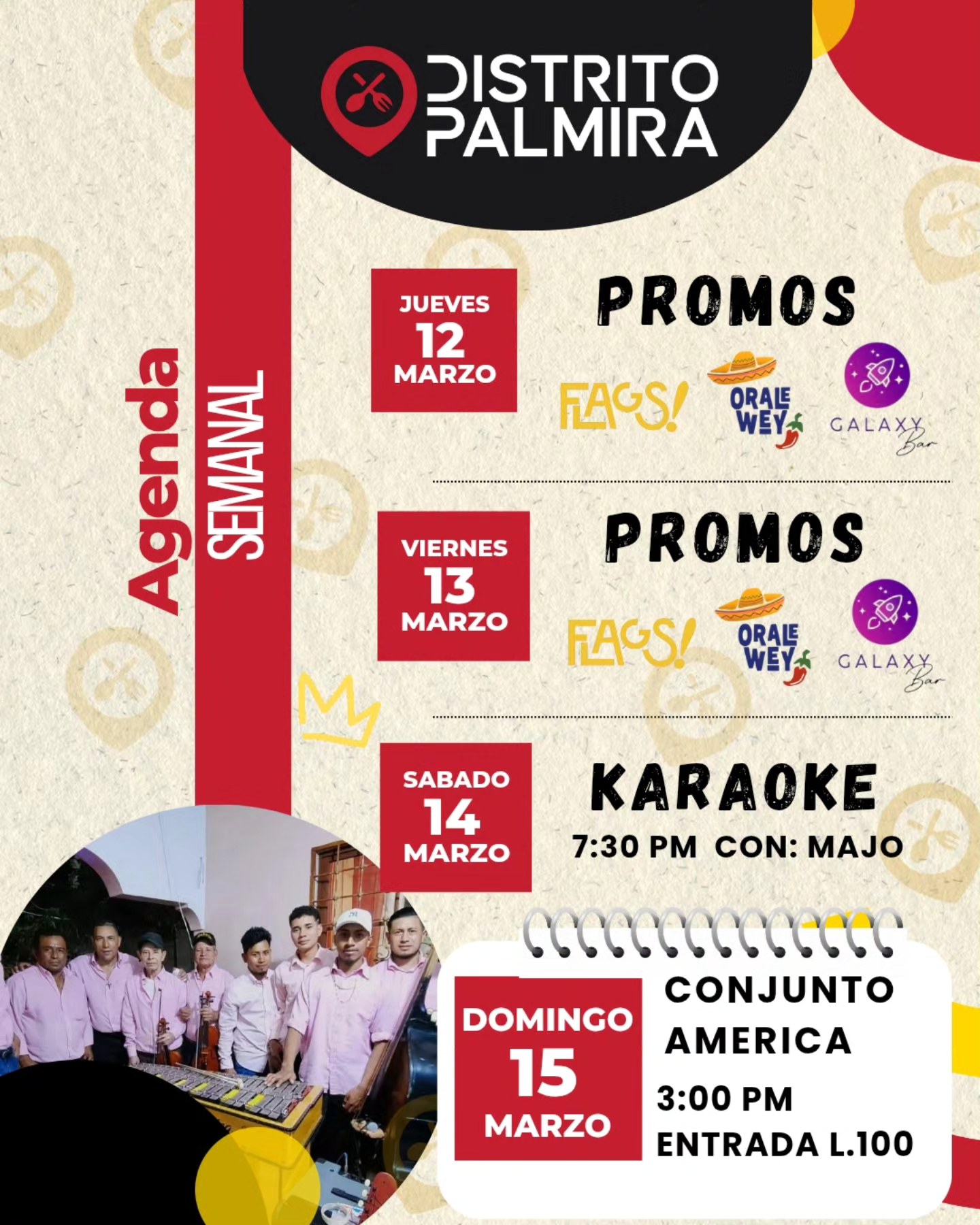 Agenda Semanal en Distrito Palmira Fecha de Inicio Martes, Marzo 10, 2026 - 12:00 AM Miércoles, Marzo 11, 2026 - 12:00 AM Jueves, Marzo 12, 2026 - 12:00 AM Viernes, Marzo 13, 2026 - 12:00 AM Sábado, Marzo 14, 2026 - 12:00 AM Domingo, Marzo 15, 2026 - 12:00 AM Entretenimiento y Medios La plaza que lo tiene todo Ven con familia, amigos y hasta von tu mascota a disfrutar de las promociones y el ambiente que siempre tenemos para ti ...