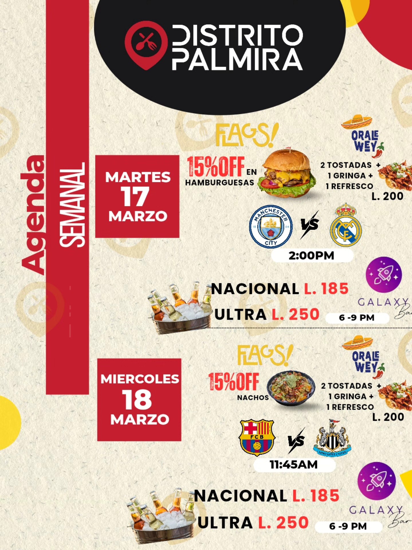 Esta semana Distrito Palmira Celebra a Papá Fecha de Inicio Martes, Marzo 17, 2026 - 12:00 AM Miércoles, Marzo 18, 2026 - 12:00 AM Jueves, Marzo 19, 2026 - 12:00 AM Viernes, Marzo 20, 2026 - 12:00 AM Sábado, Marzo 21, 2026 - 12:00 AM Entretenimiento y Medios Esta semana Distrito Palmira Celebra a Papá con grandes promociones y eventos. ¡Tu lugar de encuentro en TGU !