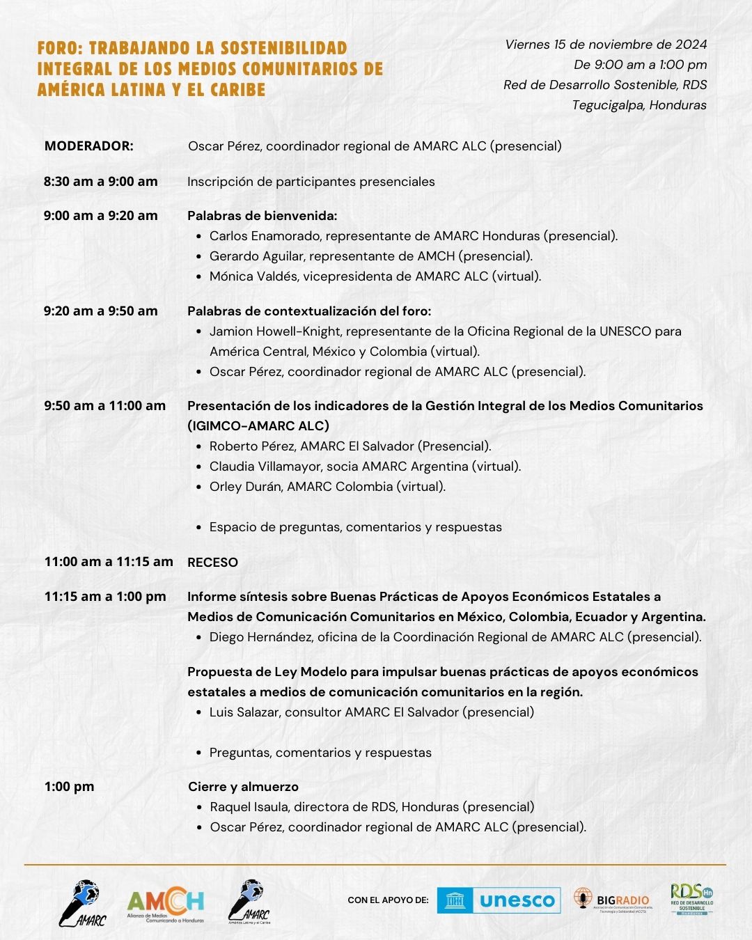 Foro: Trabajando la sostenibilidad integral de los medios comunitarios de América Central y el Caribe Fecha de Inicio Viernes, Noviembre 15, 2024 - 09:00 AM Desarrollo social Foro: Trabajando la sostenibilidad integral de los medios comunitarios de América Central y el Caribe