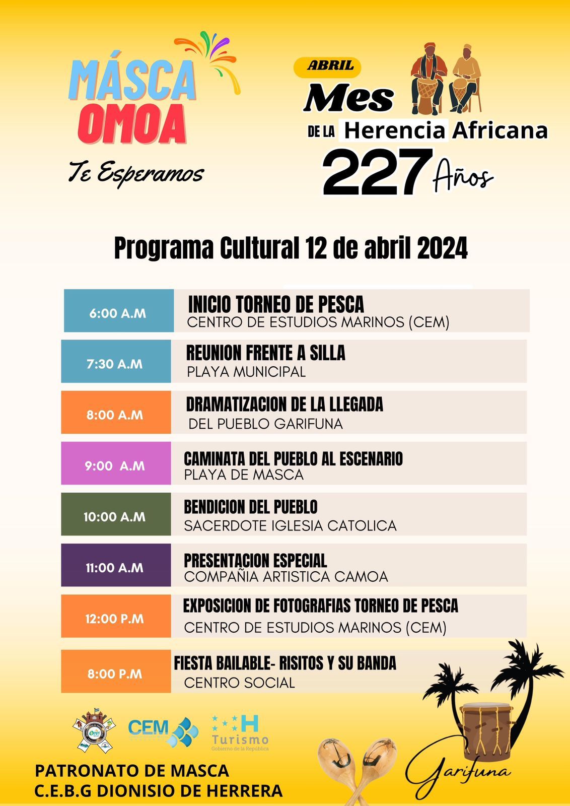 La municipalidad de Omoa , El Centro de Estudios Marios (CEM), el Instituto Hondureño de Turismo (IHT), el patronato de la comunidad garífuna de Masca y demás fuerzas vivas de Omoa te invitan a ser partícipe de la celebración de los 227 aniversarios de la herencia africana, ven y celebra con nosotros este 12 de abril en nuestra comunidad Garífuna de Masca, Omoa, Cortes, a partir de las seis de la mañana. ¡OMOA SEGURO TE ENCANTARÁ!.