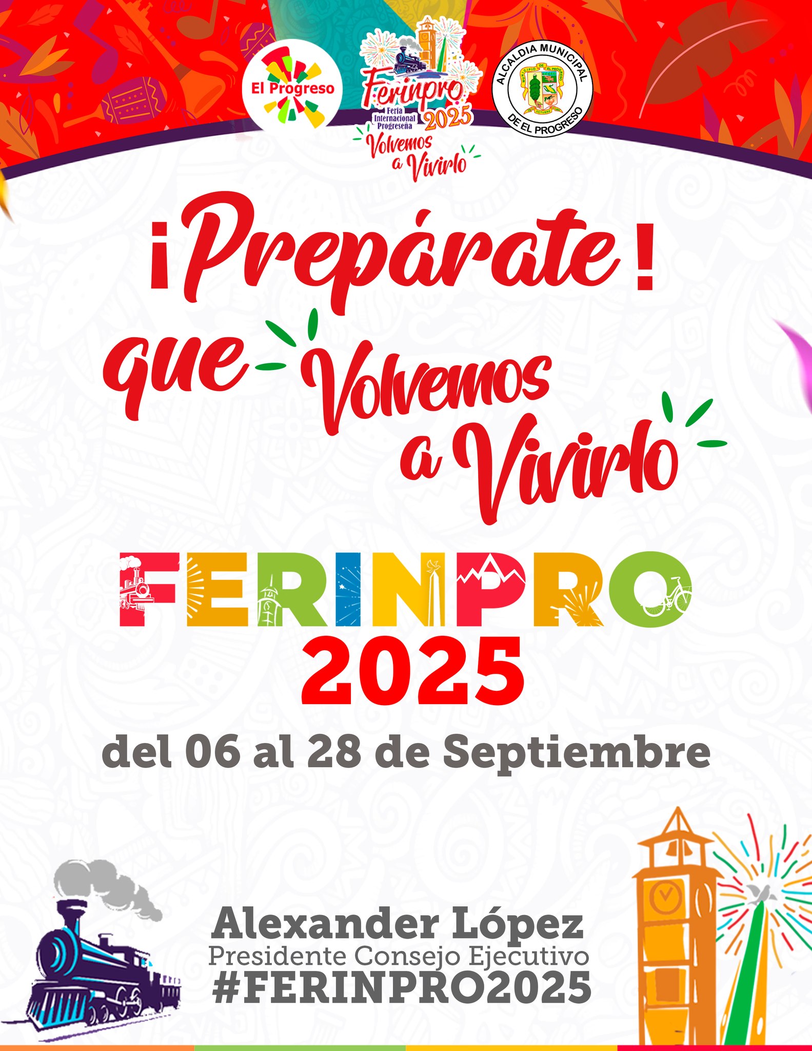 Programa Oficial: Feria Internacional Progreseña FERINPRO 2025 Fecha de Inicio Sábado, Septiembre 6, 2025 - 12:00 AM Domingo, Septiembre 7, 2025 - 12:00 AM Lunes, Septiembre 8, 2025 - 12:00 AM Martes, Septiembre 9, 2025 - 12:00 AM Miércoles, Septiembre 10, 2025 - 12:00 AM Jueves, Septiembre 11, 2025 - 12:00 AM Viernes, Septiembre 12, 2025 - 12:00 AM Sábado, Septiembre 13, 2025 - 12:00 AM Domingo, Septiembre 14, 2025 - 12:00 AM Lunes, Septiembre 15, 2025 - 12:00 AM Martes, Septiembre 16, 2025 - 12:00 AM Miércoles, Septiembre 17, 2025 - 12:00 AM Jueves, Septiembre 18, 2025 - 12:00 AM Viernes, Septiembre 19, 2025 - 12:00 AM Sábado, Septiembre 20, 2025 - 12:00 AM Domingo, Septiembre 21, 2025 - 12:00 AM Lunes, Septiembre 22, 2025 - 12:00 AM Martes, Septiembre 23, 2025 - 12:00 AM Miércoles, Septiembre 24, 2025 - 12:00 AM Jueves, Septiembre 25, 2025 - 12:00 AM Viernes, Septiembre 26, 2025 - 12:00 AM Sábado, Septiembre 27, 2025 - 12:00 AM Domingo, Septiembre 28, 2025 - 12:00 AM Cultura y Patrimonio ¡Volvemos a Vivirlo!Escanee éste código QR para conocer el PROGRAMA OFICIAL de nuestra Feria Internacional Progreseña FERINPRO 2025.#FERINPRO2025